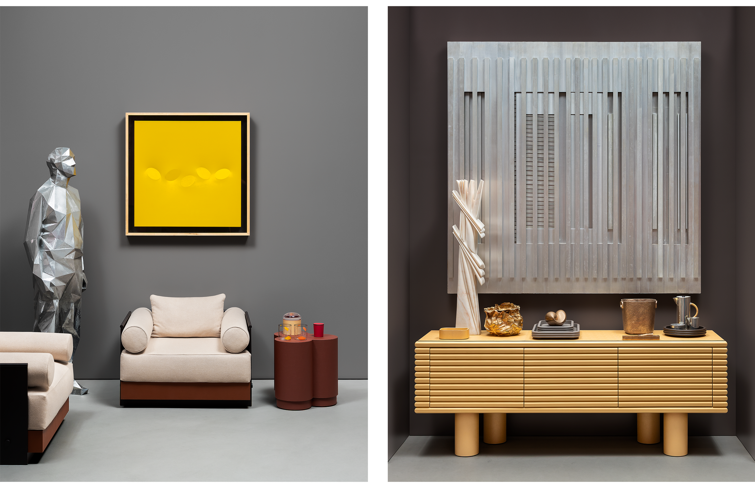 At Via della Spiga 33, on the first floor, spread over 220 square metres, in a space designed by Belgian architect Glenn Sestig, Giobaganara furniture pieces by Stéphane Parmentier, Francesco Balzano and Glenn Sestig have been developed in special colours and finishes, placed with design objects from the Giobagnara collection all hand picked by me and shown together with art and design pieces Vinson selected from Giorgio Bagnara’s personal collection. In the case of Giobagnara I found everything he needed for the 13 sets in one place. This included works by some of the great masters of 20th-century Italian art, including paintings by Agostino Bonalumi, Mario Schifano & Turi Simeti, sculpture and ceramics by Pablo Atchougarry, sculptures by Igor Mitoraj, César Baldaccini & Robert Lienhard and works in aluminium by Bernard Aubertin and Salvatore Messina.